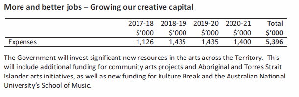 Category Expenditure 2016-17 Key Arts Organisation $4,108,918 Program $473,690 Project (including screen) $563,469 Arts Residencies $56,000 Community Outreach $1,777,998 Community Arts and Cultural Development $273,328 Out of Round $22,453 Llewellyn Hall $37,559 Book of the Year $15,000 Fringe Festival $30,000 Detail on 2017 funding recipients can be found on the artsACT website https://www.arts.act.gov.au/funding/current-funding-recipients/act-arts-fund-2017