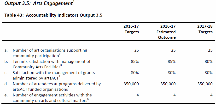 (8) Why are there no measurable targets for ACT Government directorates and agencies in relation to the arts.